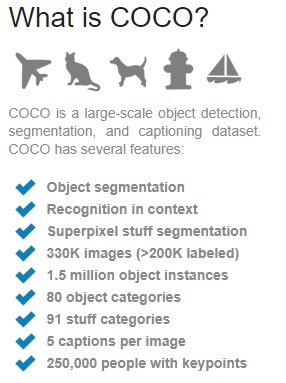 Common object in context, 흔히 보이는 물체의 모음이다. 인공지능 학습에 사용하는 데이터 셋으로 150만 개의 instance와 80개 categories로 분류되어 있다. Object segmentation, Recognition에 많이 사용되고 있다.