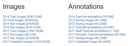 Coco는 2014년과 2017년 dataset으로 나눠서 제공하고 있다. 2017년도에 업데이트를 통해서 데이터를 추가하여 2014년과 따로 구분하였다. 2018에는 2017년 데이터를 완벽하게 사용하도록 업데이트 되었고, 2019, 2020에는 변한 부분이 없다.
